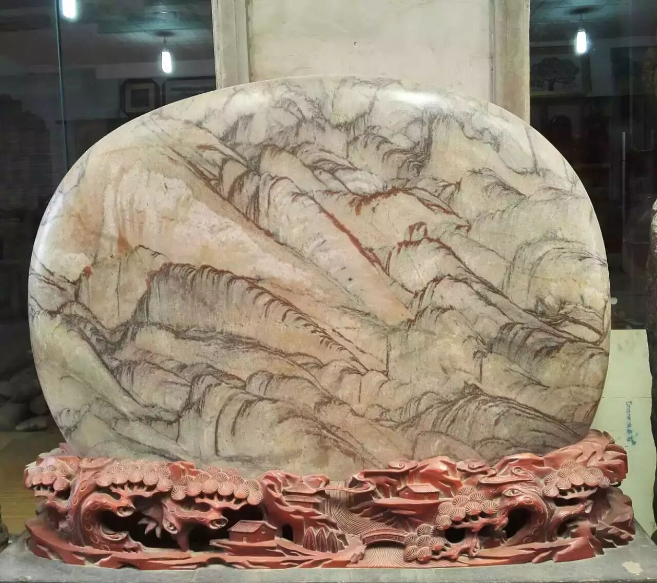 感动归感动,石头须详细看。我终于看到了石头。比照片上看到的感觉更好,令我更为欣喜的是石头的另一面,山势虽稍弱些,却韵意不减,似有一女山角盼归。石面虽有细小裂咎,却丝毫不减心里喜悦。从事采石的贾老师带我们参观了原石和加工,讲解了国画石现世过程和资源现状。产地被圈为森林公园,已被禁采、“壮丽河山”已出山七年。连老师在价格低迷时出手,心里有些不舍。品茶闲谈间,我再一次感受到赏石人“美石易手如爱女出嫁”般的滋味,喜悦与落寞调和,滋味、你懂的!