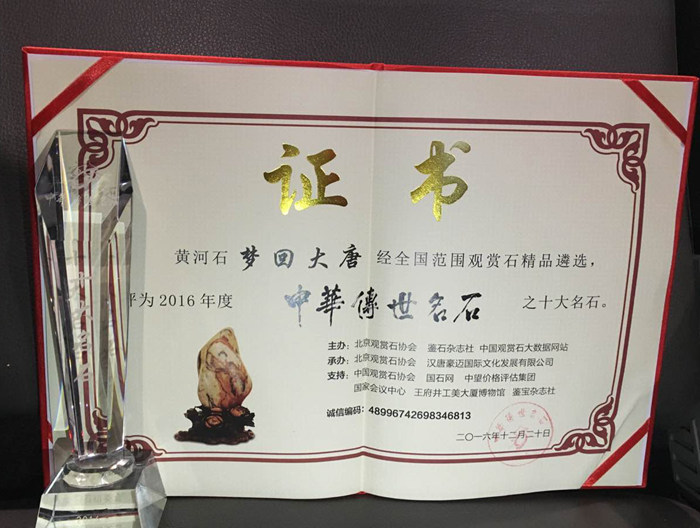 我馆藏石“梦回大唐”,以完美的构图、协调的比例、丰富的色彩、生动的气韵,荣获“中华传世名石”之十大名石!