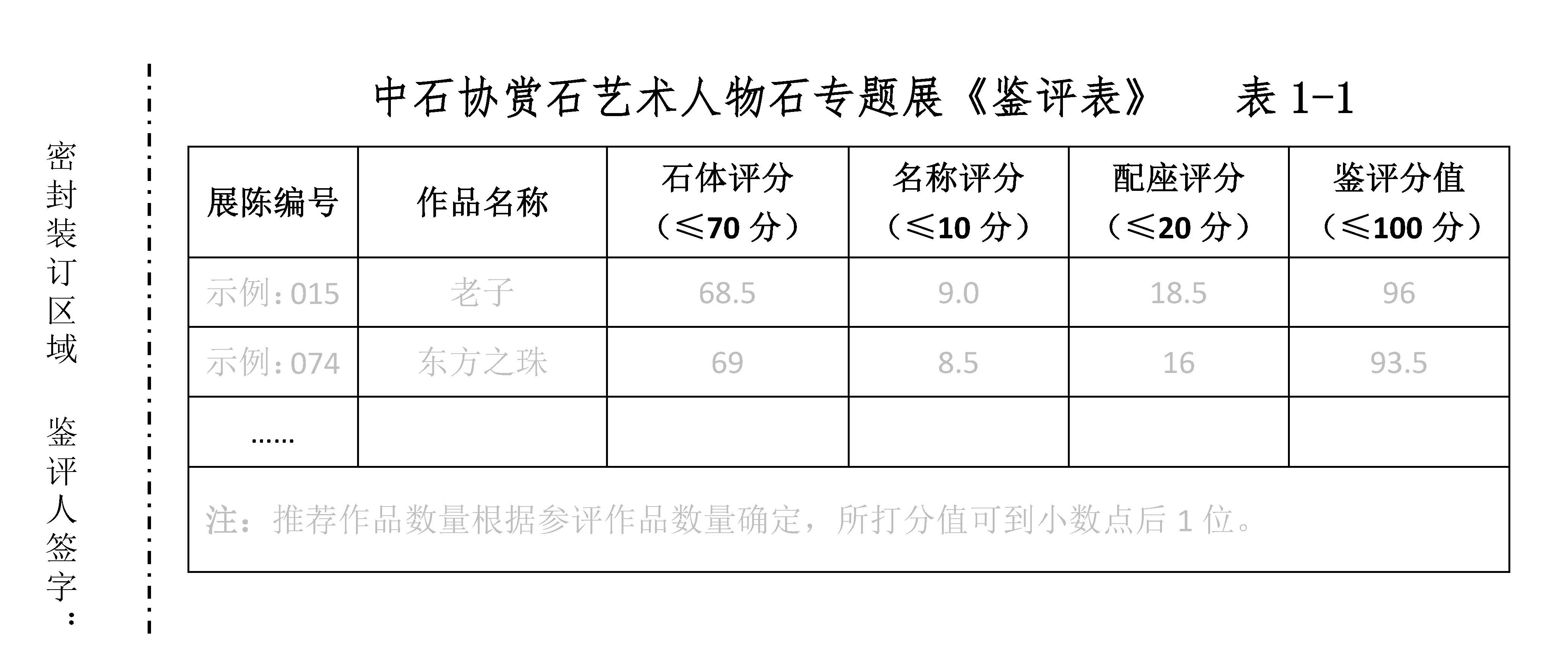 4.1各评委须娴熟《国标》,熟悉《办法》,自主筛选出鉴评分值大于70分的鉴评作品,鉴评作品数量不少于参评作品数量15%。对筛选出的鉴评作品须逐方依据《国标》就其“石体、名称、配座(装裱)”予以独立鉴评,且合计给出鉴评分值。每方鉴评作品鉴评分值须大于70分。