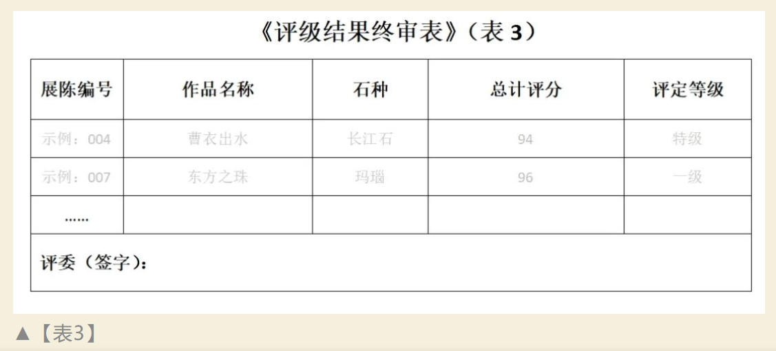 根据 (表2),进行复审。复审由评委主任和监委主任联合实施,复审时应只关注取消“假石”和评委参评作品评级资格。复审结果填入《评级结果终审表》(表3)。