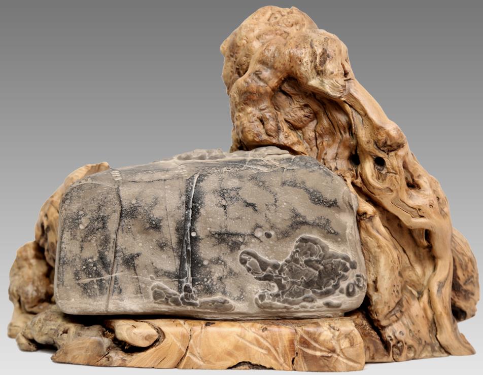 配座上,藏家考虑到此石虽然正面较为方正,但石体略薄,故而截取木根一块。利用其天然形状,将石嵌入其中,藏补结合,石木浑然一体。免漆免蜡,如自然天成,韵意逸于朴拙之外。