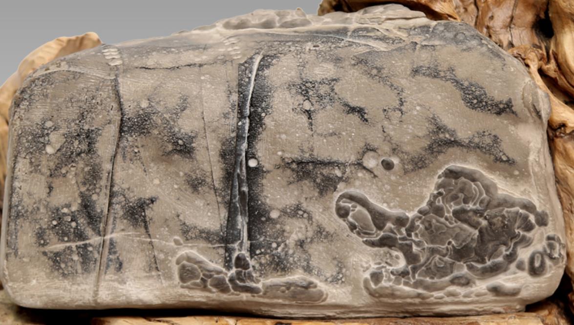 陈炉石的清理除了要考虑石肤、石质外,更需考虑石衣。石衣是包裹石肤的高岭土,有助于增强图纹与底色的色差,强化陈炉石的高古韵意,是陈炉石的重要特色之一。陈炉石的清理不能像其他石种那样,必须根据命题确定石衣的去、留、薄、厚。此石即彻底清去了龟、猴、瀑布图案部分的石衣,其他部位则石衣如纱。去留得当,薄厚相宜。