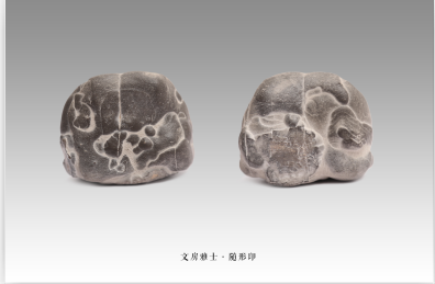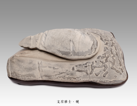 此组似文房用品的观赏石作品,由七方形纹两赏的陈炉石组成,其中砚台是二合石,揭盖可见砚池内浮雕成图;墨锭、笔架、镇纸、裁刀、闲章、铭章等皆是籽石,均浅浮雕成图,分呈景象。成套作品更是比例协调,且形、型均与实用品近似。