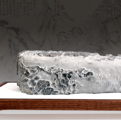 此石形如古建筑门梁,最宽石面闭合成画,浮雕沉雕兼用,纹理多样化物,渣珠妙成远山近石。构图合乎山水画理,疏密有致,形意趋和,清气洋溢。