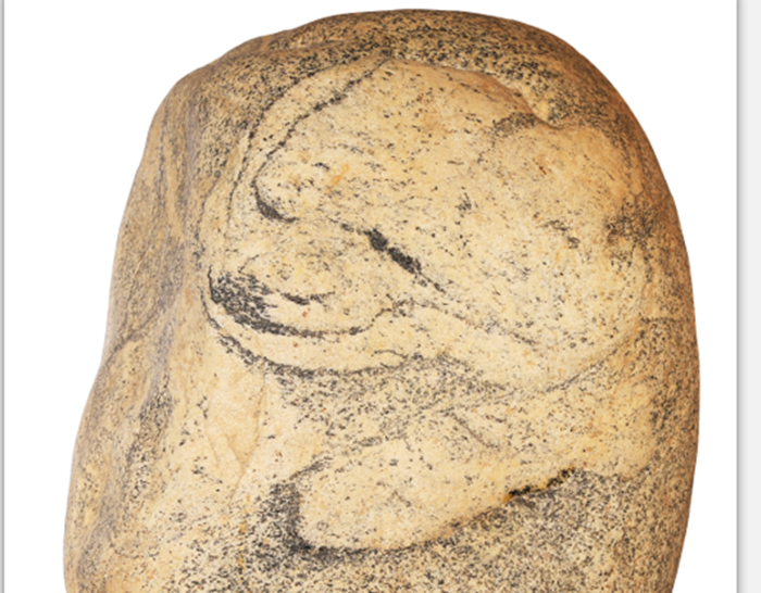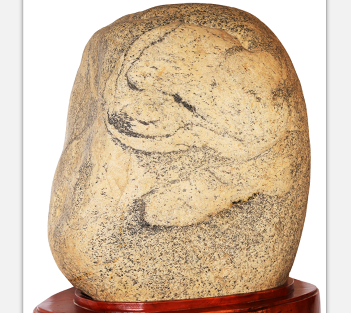 秦岭花岗岩,石形完整,质地色彩虽平常无奇,却酷似一只卧犬,憨态可掬,温顺亲人,似乎在等候着主人归来!其韵意让人疑为汉茂陵国家级石雕群的失物。卧牛,伏虎,跃马等汉石雕,也是采用秦岭花岗岩,因石拓形,八刀点睛,神态栩栩,生动曼妙。鲁迅曾赞曰“气派深沉雄大”。这只卧犬体量虽不及石雕十之一二,也只有头部前爪图案,但天公几刀浅雕后,又用淡墨勾勒,神韵全现。若不细看,便以为是人工所为。